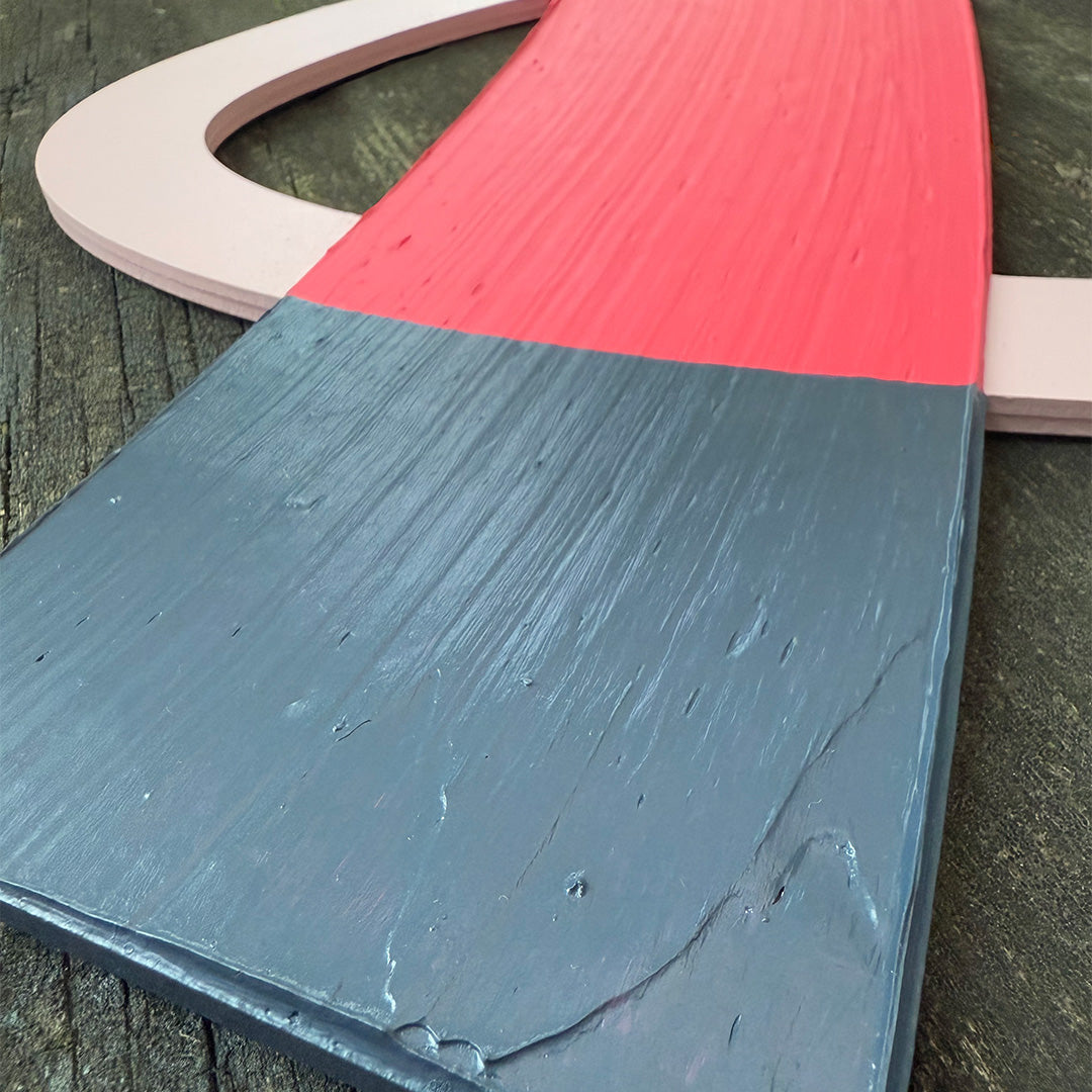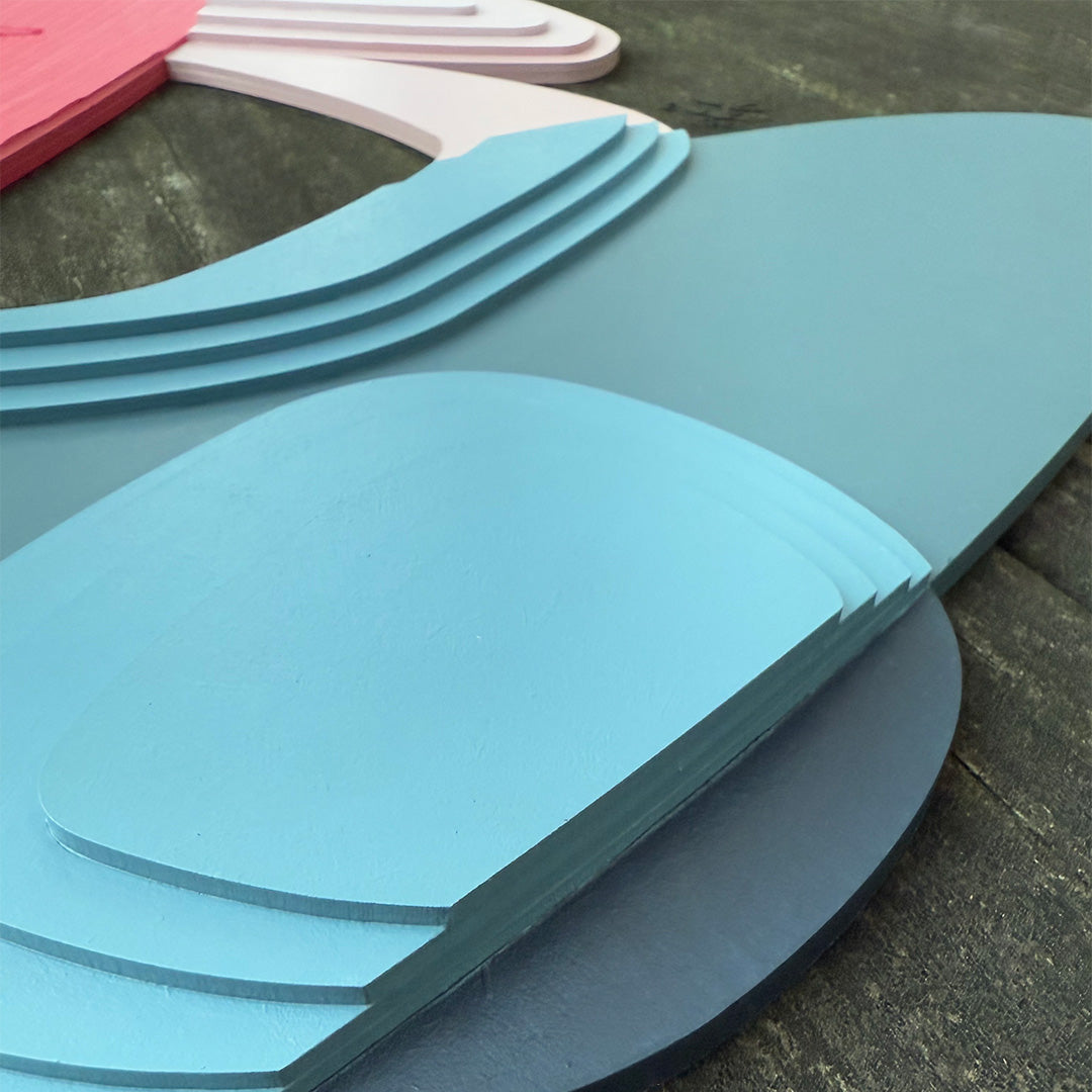 Shortcut is a bold interplay of color and form. This layered wood sculpture combines pink, navy, and flamingo red in overlapping organic shapes. Each contour reveals depth and movement, creating a vibrant statement piece that bridges sculpture and graphic design.