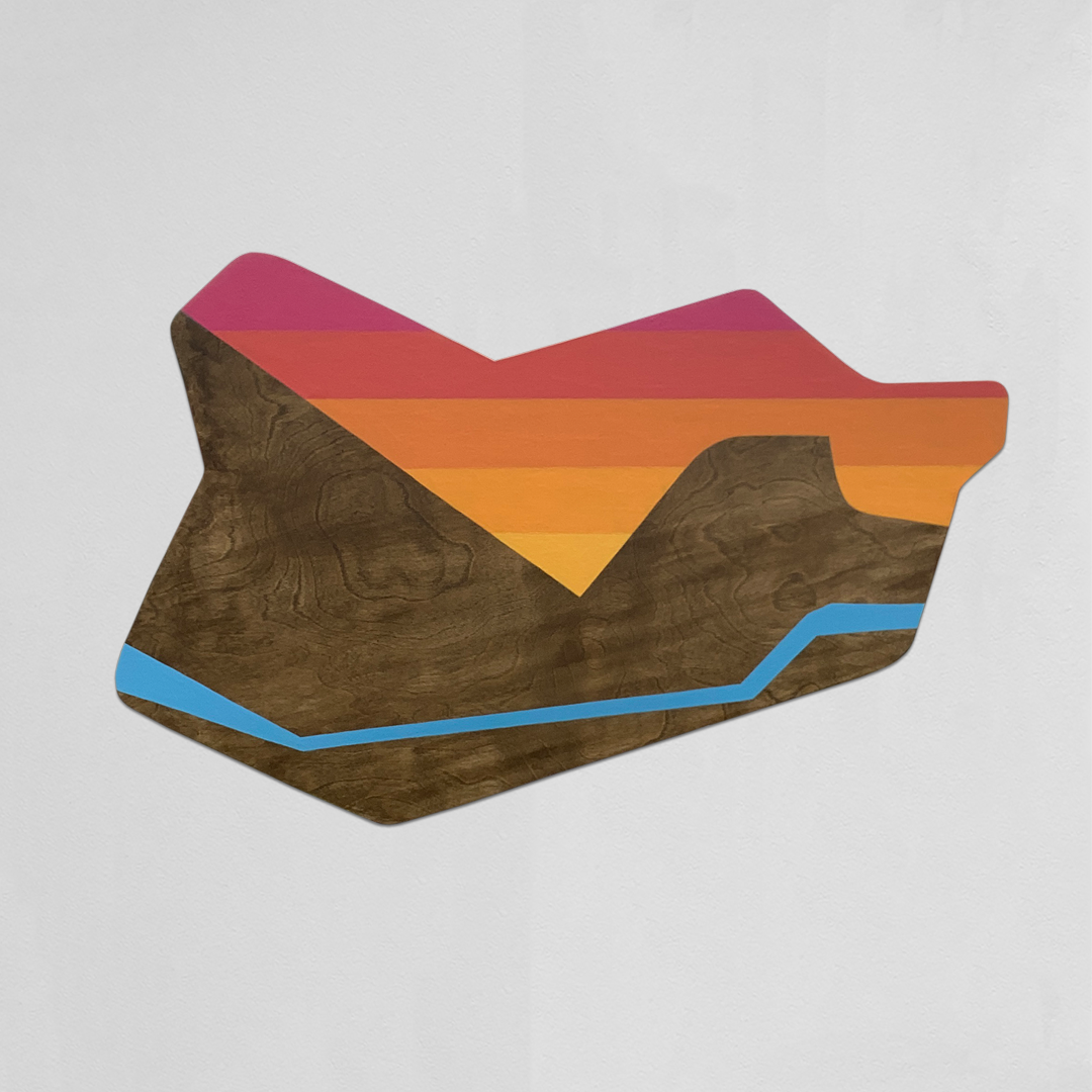 Hand-cut, hand-painted and stained original wood abstract sunset mountain scene.